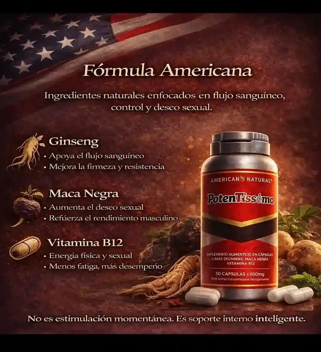Fórmula americana con Ginseng, Maca Negra y Vitamina B12, enfocada en energía, deseo y rendimiento masculino.